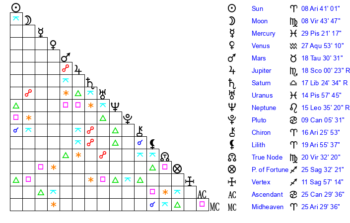 | Saturn | 18 Libra 7 | 24 Pisces 13 | 14 Libra 27 |