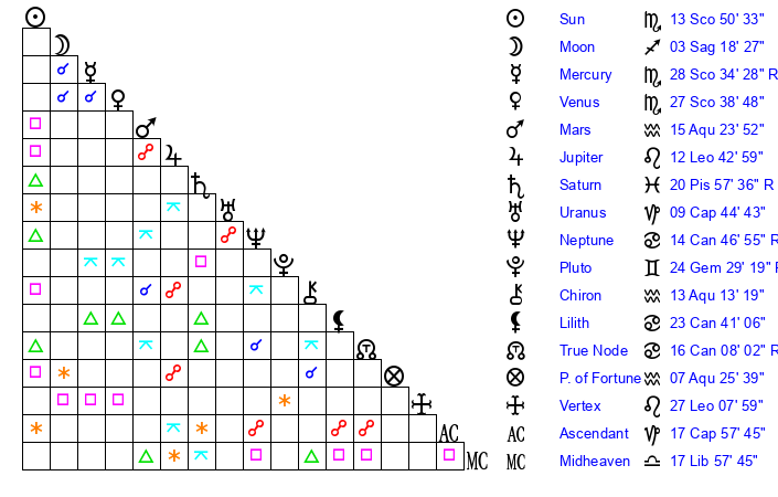 | Sun | 13 Scorpio 51 | 15 Scorpio 14 | 13 Pisces 27 |