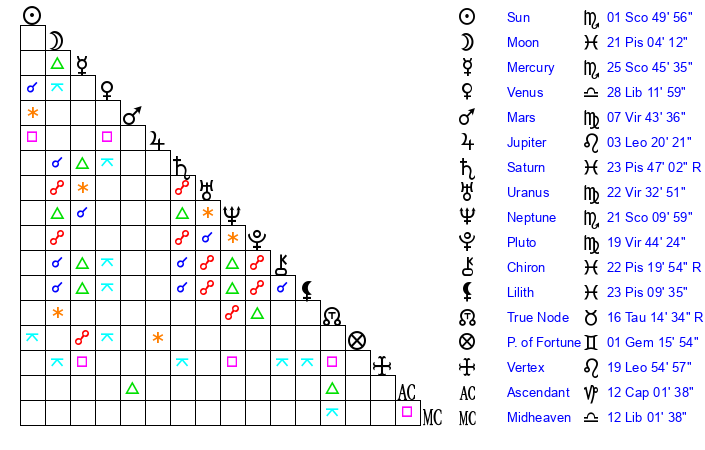 Neptune | 21 Scorpio 10 | 27 Pisces 37 | 23 Scorpio 16 |