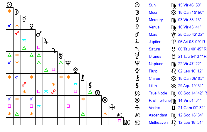 | Moon | 18 Cancer 15 | 8 Aries 34 | 17 Virgo 57 |
