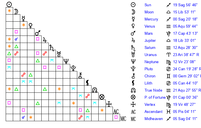 | Venus | 5 Aquarius 59 | 14 Sagittarius 34 | 12 Aquarius 51 |