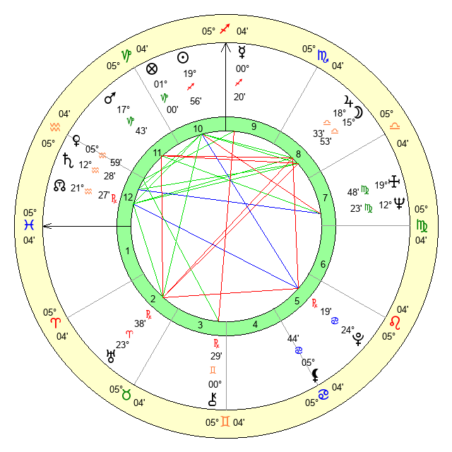 | Moon | 15 Libra 52 | 26 Virgo 51 | 8 Pisces 48 |