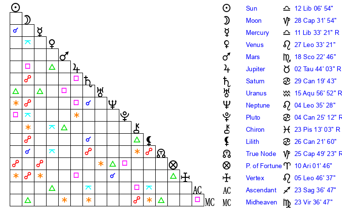| Mercury | 11 Libra 32 | 28 Libra 30 | 24 Capricorn 19 |