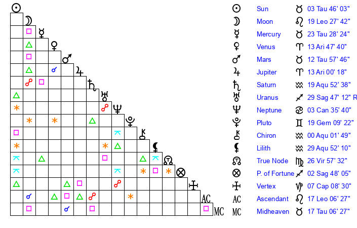 | Moon | 19 Leo 36 | 16 Pisces 44 | 0 Aquarius 42 |