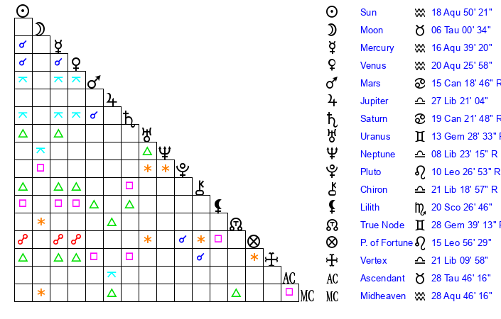 | Sun | 18 Aquarius 50 | 19 Aquarius 41 | 7 Taurus 19 |