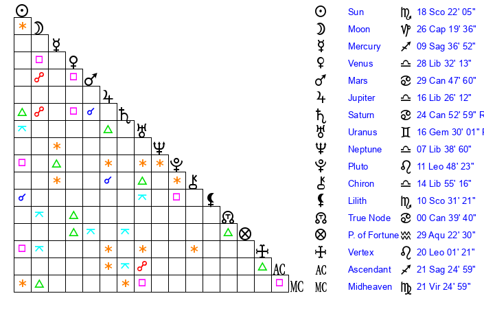| Neptune | 7 Libra 40 | 27 Pisces 19 | 8 Libra 31 |