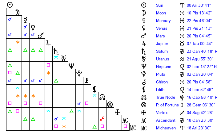 | Sun | 0 Aries 30 | 1 Aries 20 | 14 Cancer 58 |