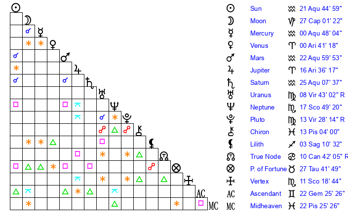 Saturn | 25 Aquarius 21 | 18 Pisces 31 | 2 Pisces 8 |