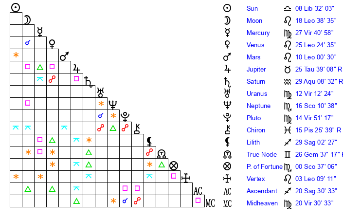 Venus | 25 Leo 25 | 14 Virgo 56 | 8 Scorpio 12 |