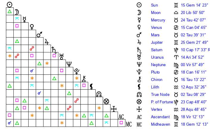 | Sun | 15 Gemini 15 | 16 Gemini 14 | 16 Virgo 16 |