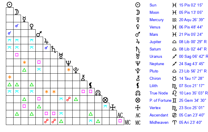 | Moon | 5 Pisces 14 | 2 Gemini 39 | 21 Libra 36 |