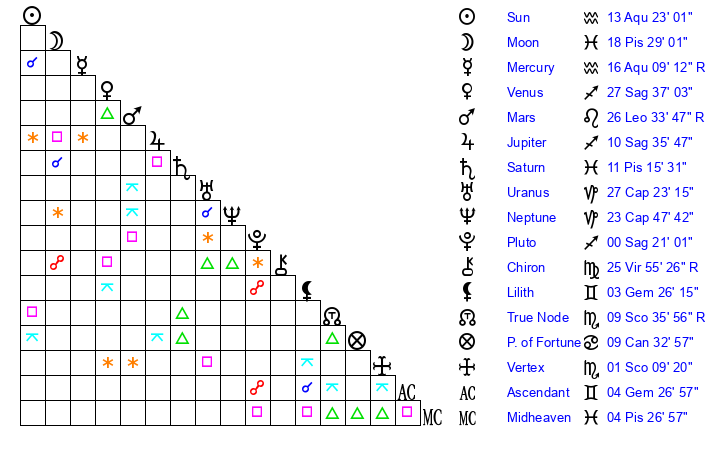 | Sun | 13 Aquarius 22 | 14 Aquarius 6 | 13 Pisces 38 |