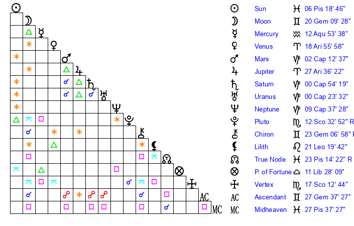 Mercury | 12 Aquarius 53 | 20 Pisces 38 | 26 Pisces 9 |