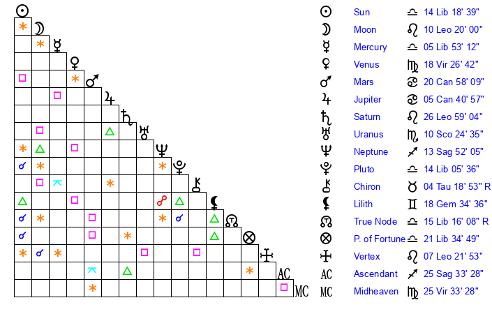 | Moon | 10 Leo 16 | 22 Aries 13 | 21 Taurus 1 |