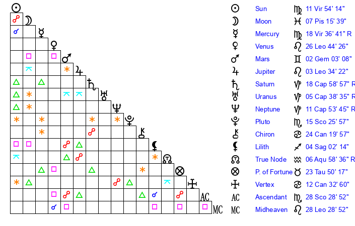 | Mercury | 18 Virgo 35 | 4 Virgo 8 | 6 Libra 57 |