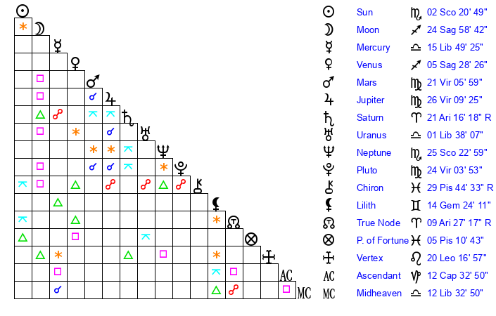 | Neptune | 25 Scorpio 23 | 29 Pisces 54 | 27 Scorpio 27 |