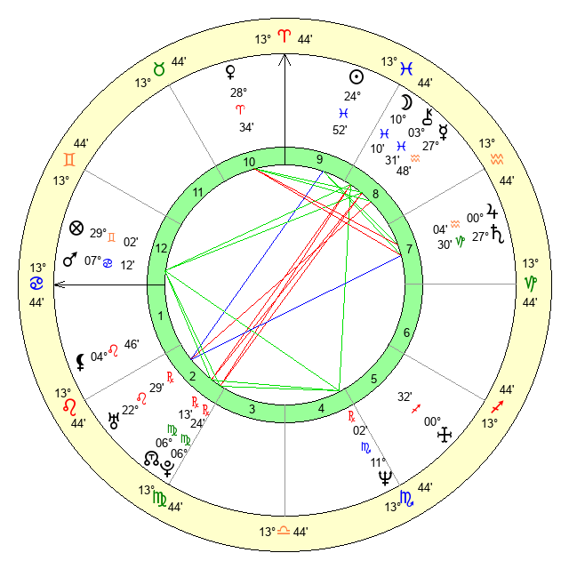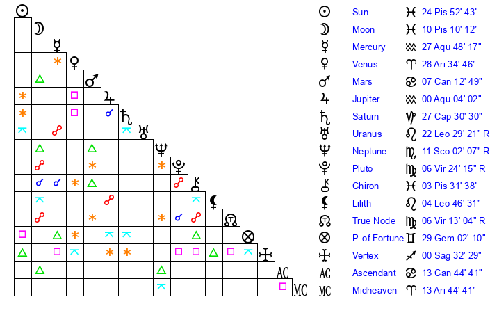 | Moon | 10 Pisces 18 | 10 Libra 51 | 14 Cancer 7 |