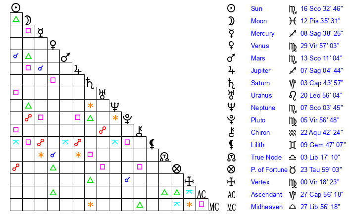 | Neptune | 7 Scorpio 3 | 29 Pisces 37 | 8 Scorpio 56 |