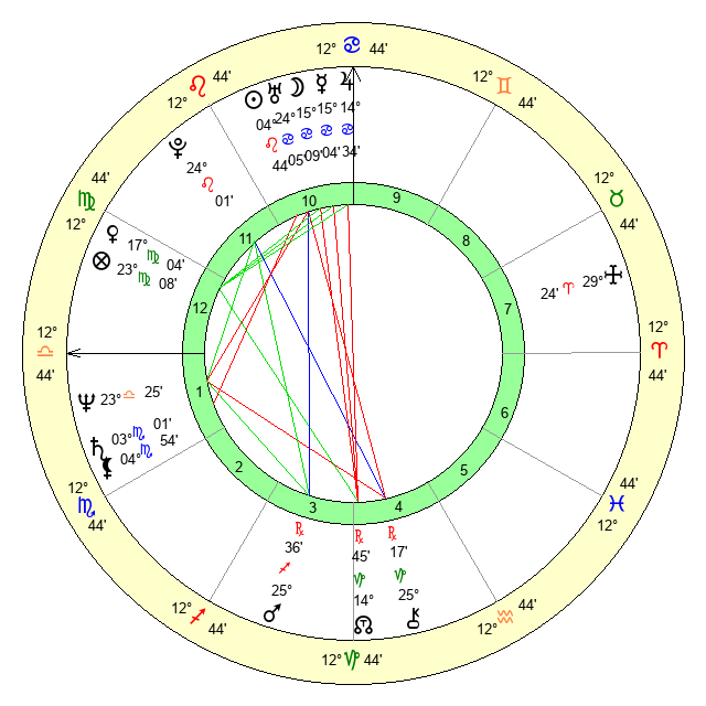 | Mercury | 15 Cancer 4 | 11 Leo 38 | 8 Scorpio 54 |