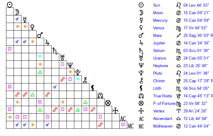 | Mercury | 15 Cancer 4 | 11 Leo 38 | 8 Scorpio 54 |