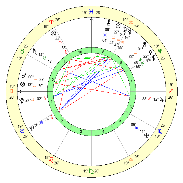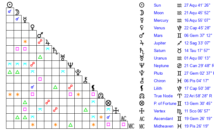 | Sun | 27 Aquarius 41 | 29 Aquarius 17 | 18 Gemini 27 |