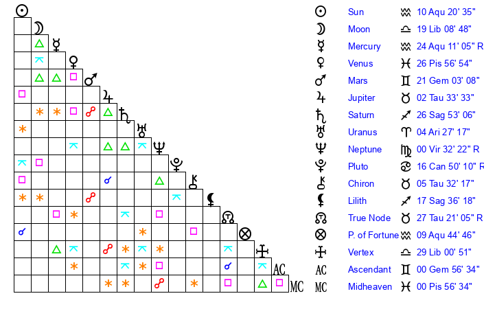 | Moon | 19 Libra 9 | 26 Aquarius 25 | 11 Aries 27 |