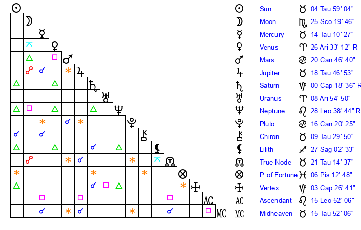 | Moon | 25 Scorpio 11 | 6 Aries 0 | 21 Taurus 52 |