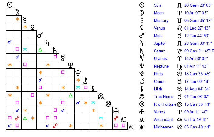 | Sun | 28 Gemini 20 | 29 Gemini 20 | 29 Virgo 39 |