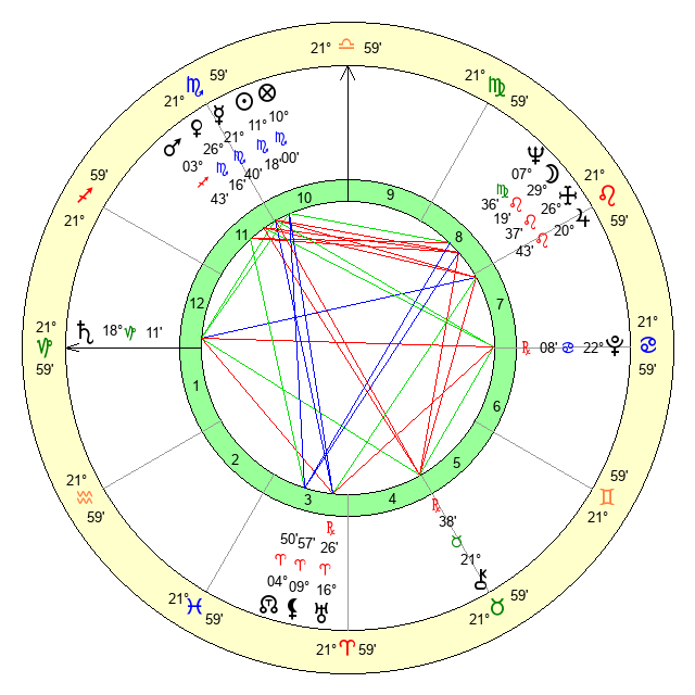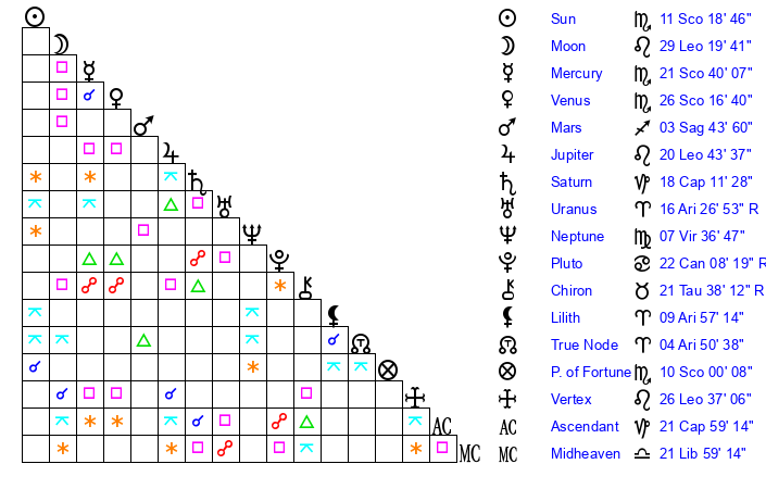 | Sun | 11 Scorpio 19 | 12 Scorpio 32 | 16 Aquarius 43 |