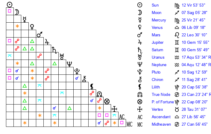 | Sun | 12 Virgo 54 | 12 Virgo 51 | 7 Libra 18 |