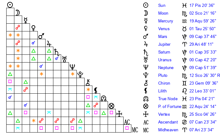Moon | 2 Scorpio 21 | 0 Cancer 21 | 16 Pisces 14 |