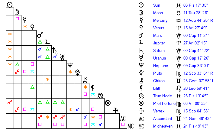 Sun | 3 Pisces 17 | 4 Pisces 19 | 10 Aries 12 |
