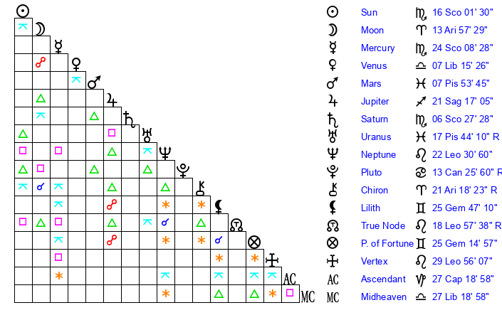 | Sun | 16 Scorpio 2 | 16 Scorpio 32 | 28 Aquarius 32 |