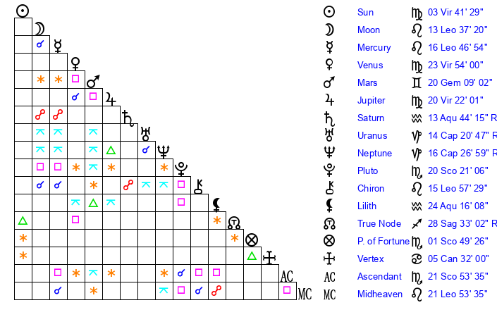 | Moon | 13 Leo 37 | 13 Libra 44 | 6 Scorpio 40 |