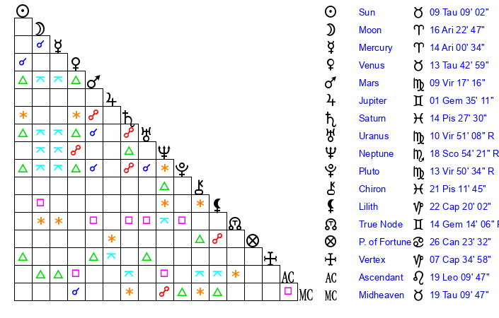 Uranus | 10 Virgo 55 | 26 Taurus 16 | 11 Virgo 30 |