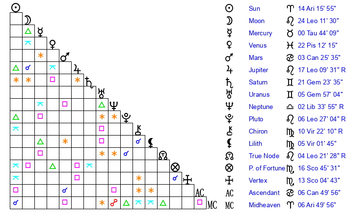| Sun | 14 Aries 16 | 14 Aries 38 | 2 Cancer 30 |