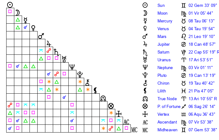 | Sun | 2 Gemini 33 | 3 Gemini 46 | 2 Virgo 29 |