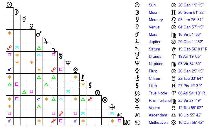 | Moon | 26 Gemini 49 | 26 Aquarius 16 | 18 Sagittarius 26 |