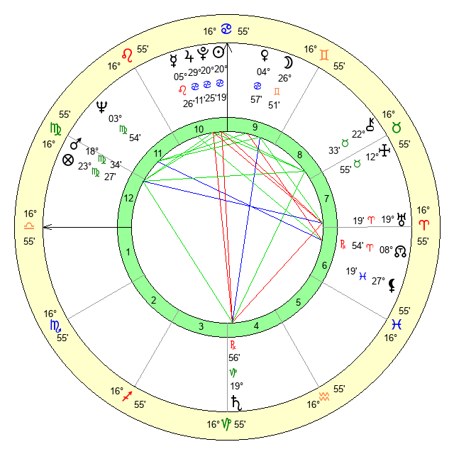 | Venus | 4 Cancer 57 | 10 Gemini 5 | 1 Scorpio 19 |