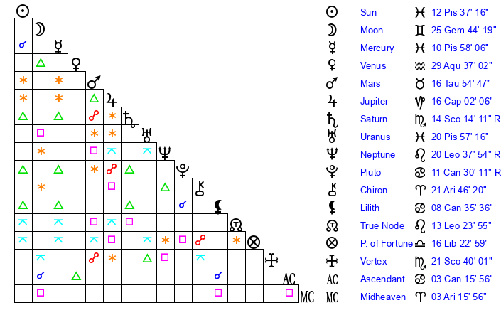 | Sun | 12 Pisces 37 | 13 Pisces 22 | 20 Gemini 13 |