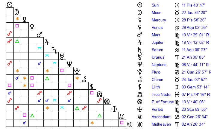 | Moon | 22 Taurus 51 | 19 Aries 6 | 26 Virgo 25 |