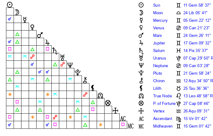 | Pluto | 21 Gemini 23 | 1 Aquarius 4 | 21 Gemini 16 |