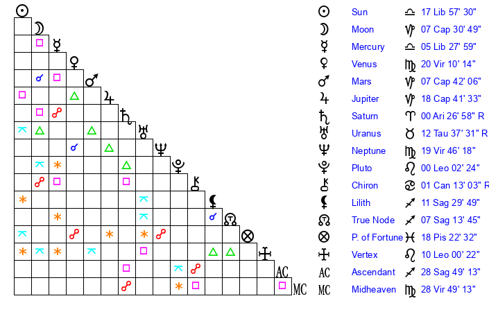 | Neptune | 19 Virgo 46 | 0 Aries 15 | 21 Virgo 5 |