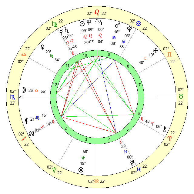 | Moon | 27 Libra 6 | 23 Scorpio 31 | 17 Virgo 46 |