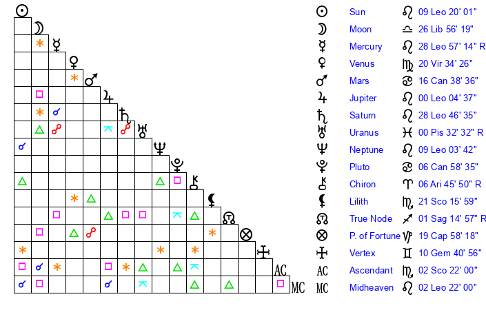 | Mercury | 28 Leo 56 | 7 Leo 45 | 15 Sagittarius 29 |