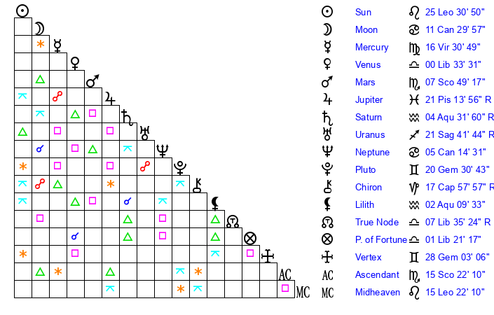 | Mercury | 16 Virgo 31 | 8 Leo 24 | 11 Capricorn 53 |