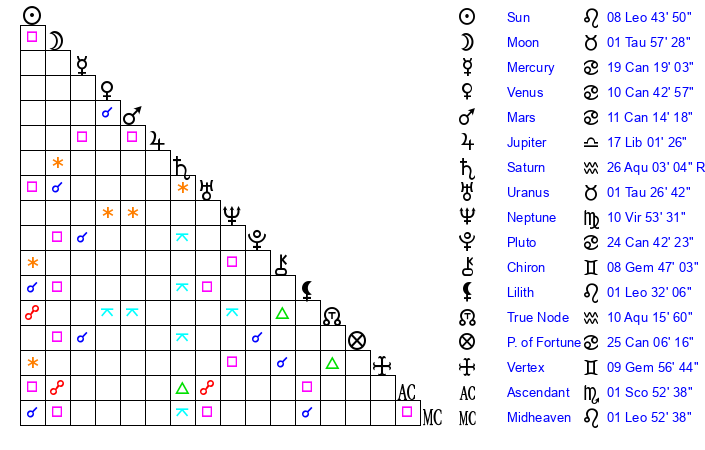 | Moon | 2 Taurus 4 | 11 Scorpio 41 | 22 Leo 17 |