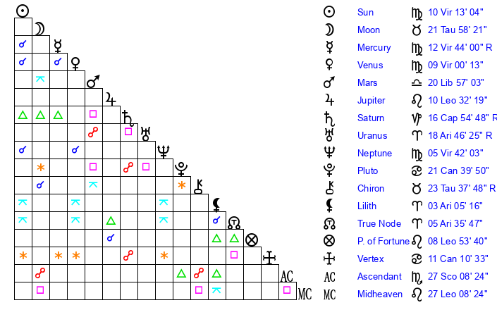 | Venus | 9 Virgo 1 | 10 Leo 49 | 6 Capricorn 13 |