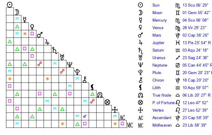 | Sun | 13 Scorpio 6 | 14 Scorpio 32 | 16 Pisces 43 |
