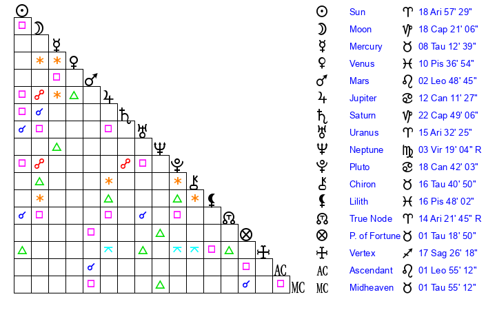 | Sun | 10 Capricorn 25 | 11 Capricorn 37 | 15 Aries 2 |